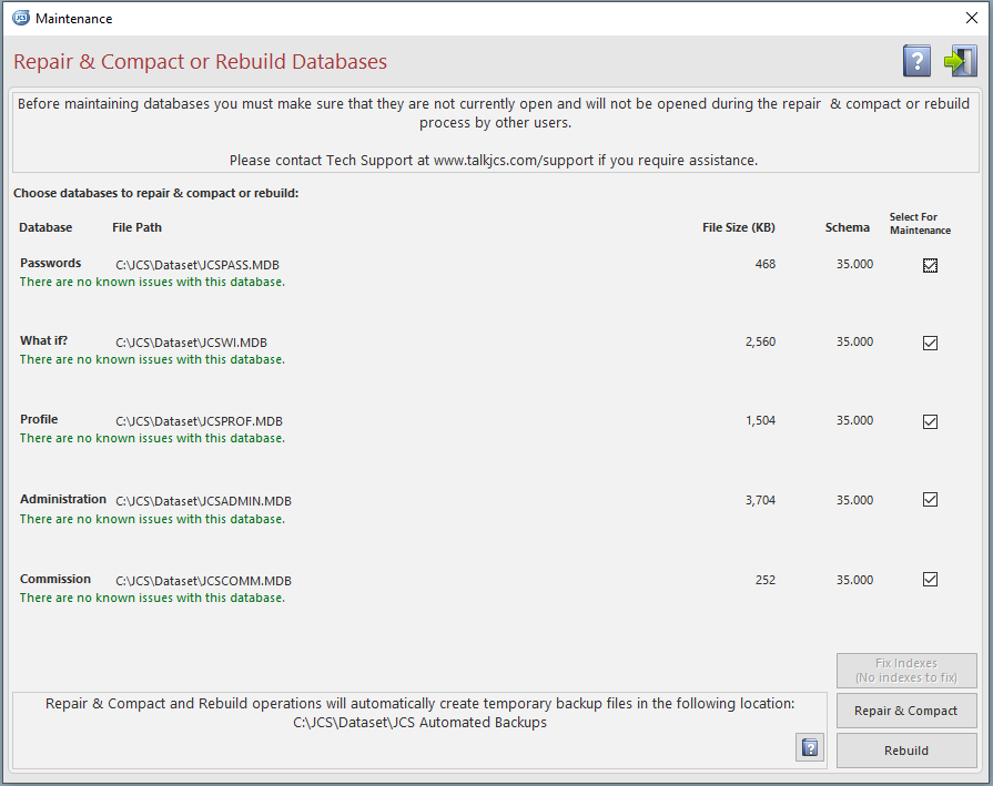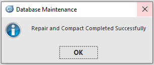 Occasionally errors can occur, preventing the Repair & Compact from completing. If this happens your data will be restored from a backup automatically made just before the procedure started. If you experience this, please contact JCS Tech Support for assistance: https://www.talkjcs.com/techsupport/technical-support.html